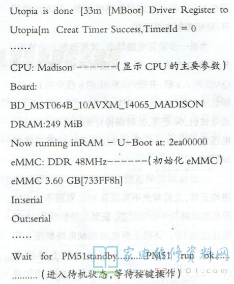 提示:1.在检修液晶彩电不开机、开机后一直显示开机画面(俗称卡LOGO故障)显示开机画面后黑屏或死机等故障时,可先查看开机打印信息,看打印信息止于哪一个阶段、哪一个节点,然后根据主板电路架构分析故障原因。2.若开机打印信息显示DDR存储器初始化失败,就先检查DDR存储器电路(先检查供电、基准电压及通讯电路,然后检查主芯片相关电路);若显示eMMC初始化失败,则检查eMMC芯片的供电与通讯电路;若显示总线初始化失败,则检查总线外挂元件。