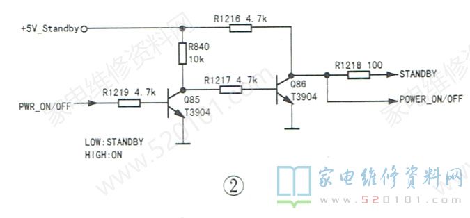 为了判断电视机是否处于待机状态,决定测量主芯片发出的开机指令电压。该机的开/待机控制电路如图2所示,主芯片发出的POW_ ON/OFF指令若为高电平,开机;若为低电平,待机。在上电瞬间,测得Q85的b极电压约为3.2V,随后降为0V,Q86的c极(POWER ON/OFF )电压也迅速由高电平变为低电平,说明主芯片先发出了开机指令,随后又发出了待机指令,同时也说明开/待机控制电路正常。