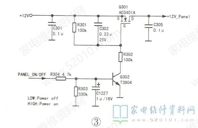 上述检测说明该机PFC电路与背光驱动电路均正常,之前背光不亮以及PFC电路不升压的原因是电路处于待机状态。既然是待机状态,上屏电压应为0V。该机上屏电压控制电路如图3所示,二次开机后,主芯片发出的上屏指令(PANEL_ ON/OFF信号)为高电平,Q302饱和导通,其c极为低电平,P沟道场效应管Q301导通,其D极输出12V电压供给逻辑板。上电测得PANEL_ ON/OFF信号为高电平,Q301、Q302均导通。按理说:待机时PANEL_ON/OFF信号应为低电平,是什么原因导致主芯片发出的上屏指令错误呢?