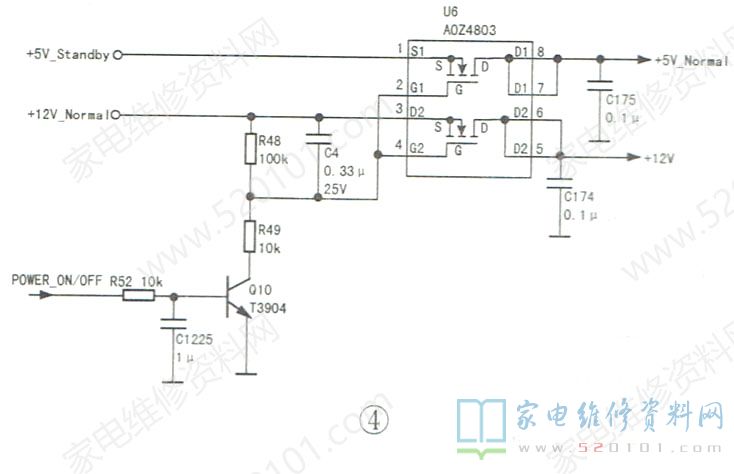上电后手摸主芯片,只有微热感。结合该机的开机打印信息,基本排除主芯片损坏的可能性,因为根据经验,若主芯片损坏,通常发热严重,并且无开机打印信息显示,或者只能显示几行信息。既然主芯片无问题,那么故障原因会不会是主芯片的供电时序异常呢?查看该机主板上各组供电的形成电路,发现+ 12V电压应在二次开机后才出现,其形成电路由上电时序控制管U6 (AOZ4803)与三极管Q10等元件组成,如图4所示。