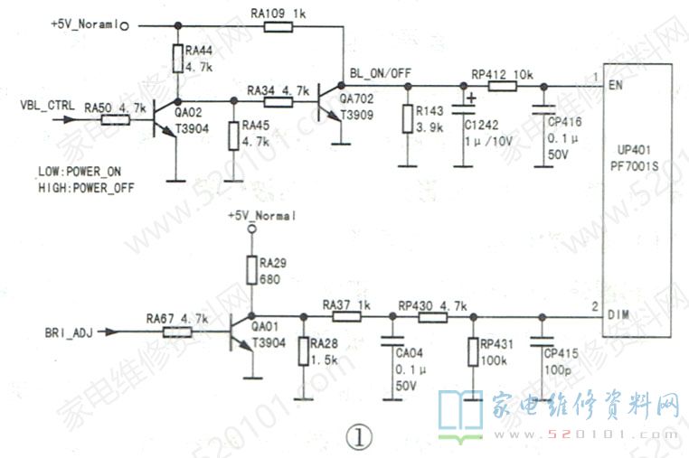 测得背光控制芯片UP401(PF7001S)的①脚(EN端)电压为0V,正常时约为4.8V。顺着线路查找,发现UP401的①脚与背光开/关控制电路相连,如图1所示。