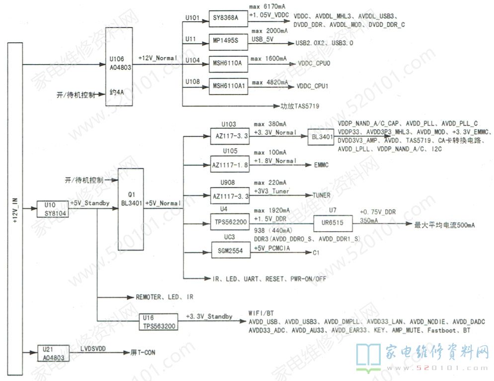 接修一台长虹55Q3R型液晶彩电(ZLS69H机芯),故障表现为三无。上电,测得主板插座J1200①~④脚的12V供电正常,但16脚开机信号(POWER _ON/OFF )为低电平,正常时应为高电平3V,由此判断主板有故障。该机主板的电压分布如图1所示。