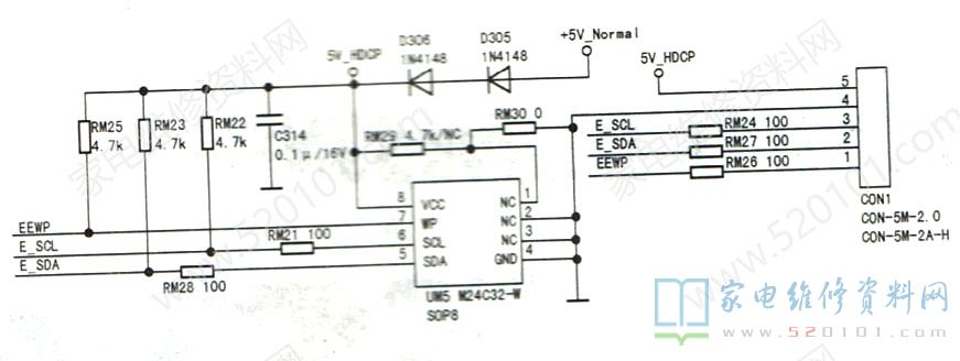 测试⑤、⑥脚总线电压,发现⑤脚电压为1.2V,正常时这两脚电压应在4.9V左右变化。检查⑤脚外围电路,未发现异常,怀疑UM5损坏。换新uM5后试机,故障排除。