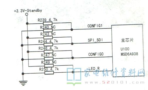 值得一提的是,在检修该机芯液晶彩电不开机故障时,除检查上述电路外,还需检查U100内CPU功能配置脚电平状态,如图2所示。