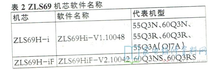 注意:ZLS69机芯分ZLS69H-i和ZLS69H-F两类,其软件名称与代表机型见表2。