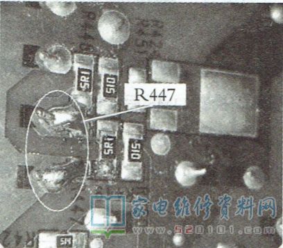 接修一台长虹LED49C1080n液晶彩电(ZLS53G-i机芯),开机后背光亮一下熄灭。此机为返修机,上次换过灯条,约一月后故障复发。经查,灯条有故障。为防止故障复发,在更换灯条后,决定降低灯条工作电流。在改动前,测得灯条电流为420mA。增大二合一电源板(型号:HSL35D-1MK 400)上电阻R447的阻值,如图1所示,将灯条电流降至300mA。长时间试机,图像、声音均正常提示:在部分LED液晶彩电中,LED灯珠故障率较高,换新后易故障复发,究其原因是灯珠的工作电流巳接近极限,工作温度较高。在实修此类故障时,建议改变灯条电流设定电阻的阻值,使灯珠电流降为原电流的70%~80%,这样既不明显影响背光亮度,又有利于延长灯珠的使用寿命。
