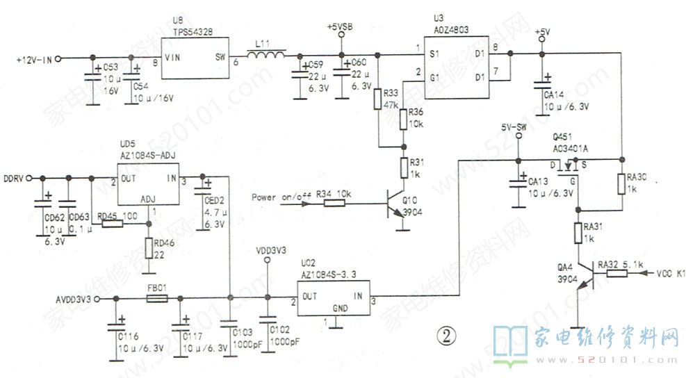 转向检查主板,在未自动关机前,手摸三端低压差稳压块U02( AZ1084S 3.3 )、UD5( AZ1084S -AD])及主芯片(表面贴有散热垫),温升较快,这会不会是故障原因呢?查看电路,U02是将输入的5V电压降压为3.3V,供给主芯片、存储器等电路;UD5是将输入的3.3V电压降压为1.5V, 供给DDR存储器,如图2所示。
