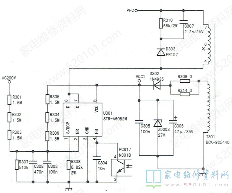 接修一台长虹UD55B6000iD液晶电视,故障表现为三无。因指示灯不亮,怀疑该机副电源有故障。拆机检查,发现电源板(型号HS250S-4SF01)上副电源块U301(STR-A6052M )炸裂、保险管F101断路。更换U301后细查⑦、⑧脚外围元件D303R310、C307和T301,没有发现异常,相关电路如图2所示。