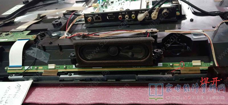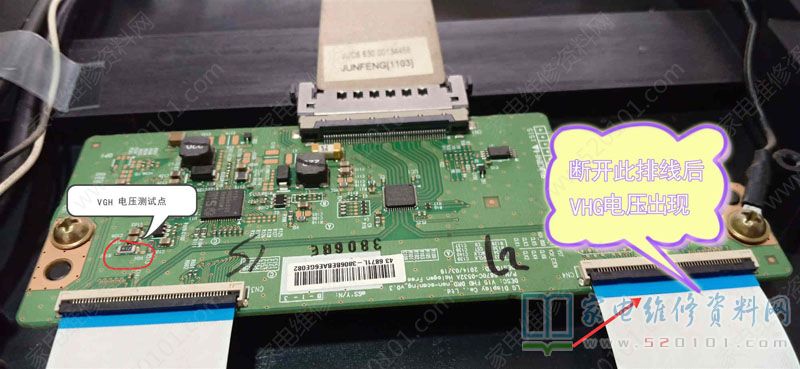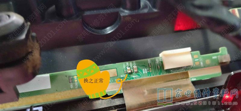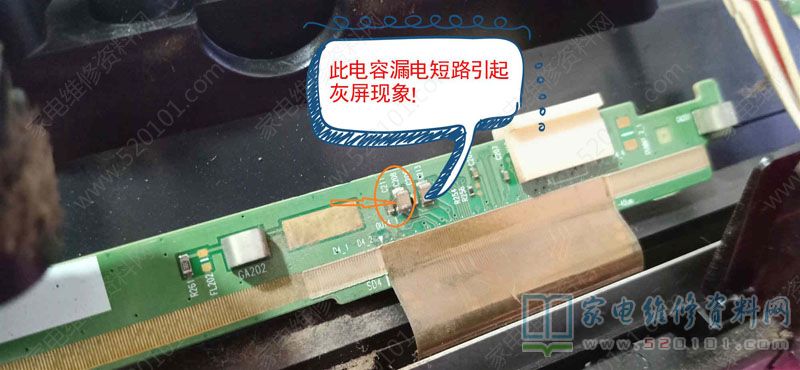接修一台长虹电视,上电开机出现背光亮,灰屏现象,拆盖上电,首先测量逻辑板上的VGH电压为0V!断开面对逻辑板的右边接屏的排线,测量逻辑板上VGH电压出现!说明右边的屏边板元件或屏内部行列驱动电路出现短路情况。(此机屏型号是M430F14-E2-L)。在线测量短路的边板各个电容,发现C208短路!用铬铁焊开此电容,接上排线上电试机,测VHG电压出现!看屏幕已出现开机画面。随后,在废旧电视屏幕边板上拆一个VGH电路的电容换上,上电试机,图声正常。