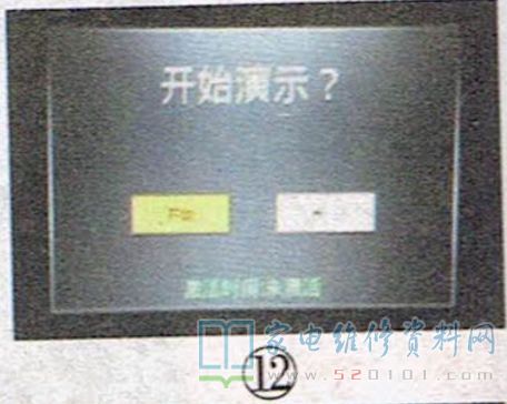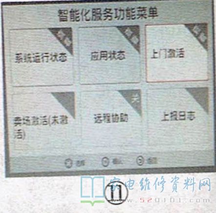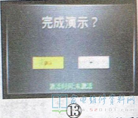 在智能化服务功能菜单中选择“上门激活”按钮,屏显“开始演示?”提示,如图12所示,选择“开始”按钮后电视机自动返回图11的状态,这时再选“上门激活”按钮,当屏显“完成演示?”提示时,如图13所示,按确认键即可。提示:1.采光用V1.00047版本软件的ZLM50机芯彩电,因软件问题,无法调出激活菜单,这时可先用U盘强制刷机为低版本,然后再进行激活操作。2.部分ZLS59机芯彩电无法调出激活菜单,这时可先用U盘强制升级到最高版本,然后再进行激活操作。