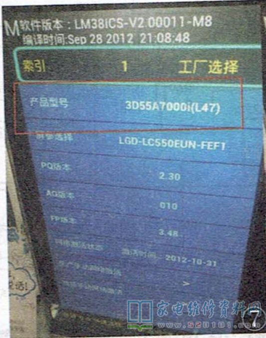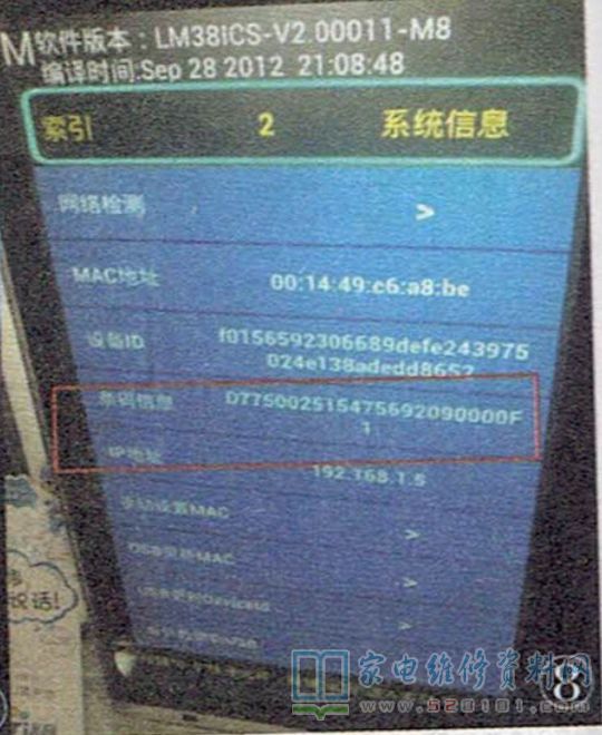 值得注意的是,该类机芯智能电视的机型(即产品型)与机号(即条码信息)须从总线菜单中获取,具体方法是:先进入总线,打开工厂模式一项,在“工厂选择"菜单(索引1)及“系统信息”菜单(索引2)中找到相关选项,如图7、图8所示,这时按菜单键与数字键0、8、1、6记下,只有这样才能确保电视机上传的激活信息正确。