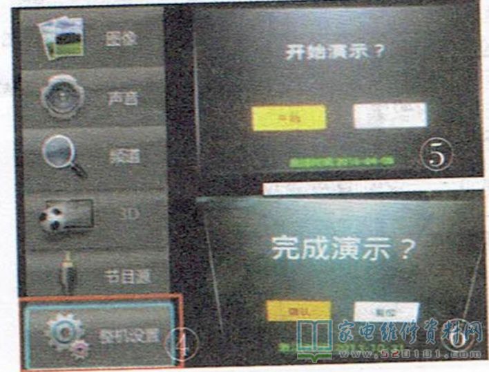 先按菜单键进入选择界面,然后选择“整机设置”,如图4所示。接下来按菜单键与数字键0、8、1.8,屏显如图5所示,选择“开始”,当屏显“完成演示? "时点击“确认"按钮,如图6所示,随后电视机若显示“演示成功”和“上传演示信息成功”提示,则表示电视机已将激活信息上传完毕。