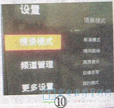 3.ZLS58、ZLS59、 ZLM60、ZLM61机芯先按遥控器上的菜单键,在设置菜单中选择“情景模式”,如图10所示,再将光标移至“标准模式"上,这时按遥控器上方向键的上、右、右键,这时屏,上出现数字小键盘,操作数字小键盘,输入0、8、1、8或0、8、2、8即可进入智能化服务功能菜单,如图11所示。