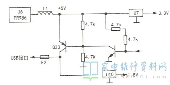 在检修过程中,用户说他家小孩常用该机的USB接口为手机充电。由于手机的充电电流较大,即流过Q33的c.e极的电流较大,长时间工作后导致Q33的性能变差。