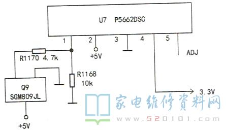 测量其②脚+5V电压正常,而④脚输出为0.7V,①脚(EN控制端电压为0.2V。U7的①脚外接复位芯片Q9( SGM809JL)。正常开机时,其复位端电压略下降后又上升到正常值。实测Q9复位输出电压为+5V,经电阻R1170后降为0.2V,怀疑U7不良。悬空U7的①脚,测其①脚对地电阻为12k,而①脚正常对地电阻约为1.7k。拆下贴片电阻R1168,测其阻值仅有1.7k, 远小于标称值10k,更换R1168后开机,3.3V电压恢复正常,二次开机,图、声均正常。此时测U7的①脚电压为3.3V。