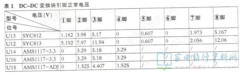 接修一台长虹LED32C1000n型液晶彩电(ZLS53G-IP机芯),故障表现为不开机。测电源供给信号处理部分的12V电压正常,但12V转5VSTB变换块U12(SYC813)输出端①脚电压为0V。该机的12V电压分布如图1所示,各DC-DC块的引脚电压见表1。
