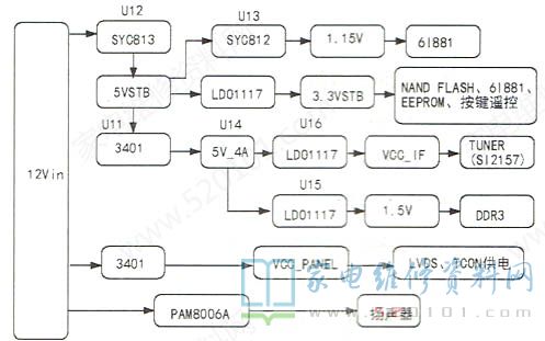 从图中可看出只有U12输出5V后,U13.U14才会分别输出1.15V、3.3VSTB电压,主芯片U11(MSD6I881YUN-XZ )控制系统工作。