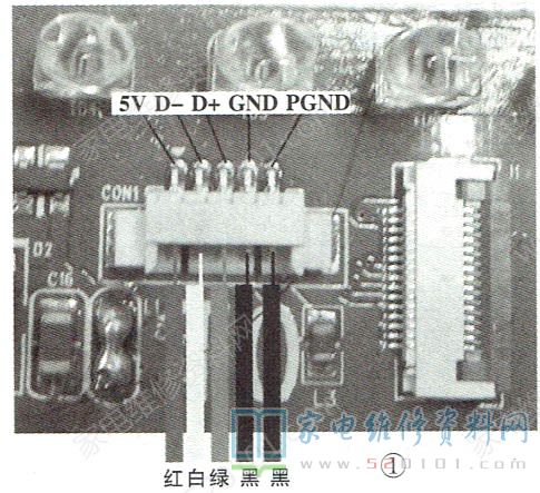 其中,GND和PGND(屏蔽线)在插上触摸屏后呈直流短路状态。机芯板一侧的插座引脚定义及线束颜色如图2所示。实修时,先用刀片挑出机芯端和触摸屏端连接线的插针,然后按照正确的线序插入连线插头即可(注意:拔出触摸屏侧的插头前,先小心去掉热熔胶,以免损坏插头)。