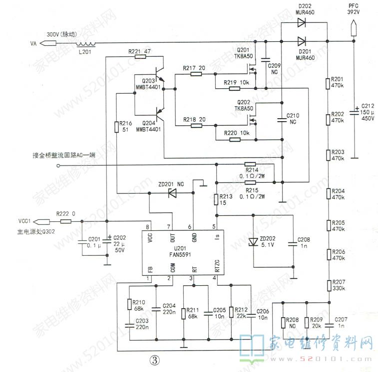 Q203为电流放大管,Q204 用于Q201 Q202在截止瞬间快速泄电Q201、Q202的S极所接R214、R215为工作电流检测电阻,检测所得电压接入U201的⑤脚。当⑤脚电压超过-0.6V时,过流保护电路启动,IC停止工作。U201①脚外接PFC电压取样电阻R201~R209,具有以下功能:一是检测PFC输出端是否短路,当此脚电压低于0.3V时,IC判定PFC端存在短路现象,电路停止工作;二是对PFC电压进行检测,U201据此控制⑦脚驱动脉冲占空比,以稳定PFC电压;三是此脚电压高于2.7V时,IC停止工作。
