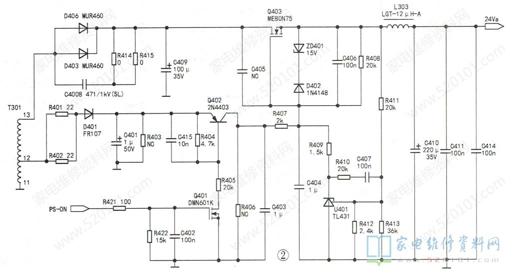 需说明的是,Q403受由Q402、Q401组成的开/待机控制电路控制。待机时,PS-ON为低电平,Q401 Q402截止,Q403因G极为低电平而截止:开机后,PS-ON为高电平,Q401~Q403导通,输出24V电压。图2中C408、R414、R415组成整流管截止时反峰脉冲的泄放通道,以保护整流管。