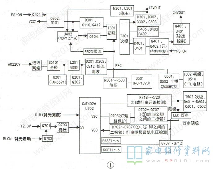 U402工作后,T301的①-②绕组的感应电压经R116、R117限流及D104、C110整流滤波后得到直流20V电压,再经Q412、ZD102等元件稳压后,得到约15V电压,经D103降压后接入U402的⑥脚。二次开机后,光耦N101导通,Q302导通输出的14V电压(vCC1),经D107、R120分成两路:一路给PFC校正块FAN5591(U201 )⑧脚供电,另路给NCP1393(U501 )①脚供电,PFC电路和背光电路启动工作。