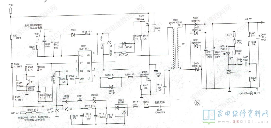 例1:一台UD55C600OI型彩电,开机半小时左右背光熄灭。分析检修:测主电源输出12V正常,但背光电压为0V。测U501的①脚(vcC供电)电压为正常14V,③脚(BO电压在开机时为正常值2V,但工作一段时间此脚电压却降为0.5V。转向检测U501的③脚外围电路(见图5)。断开R522后故障依旧,说明故障与背光电路无关。