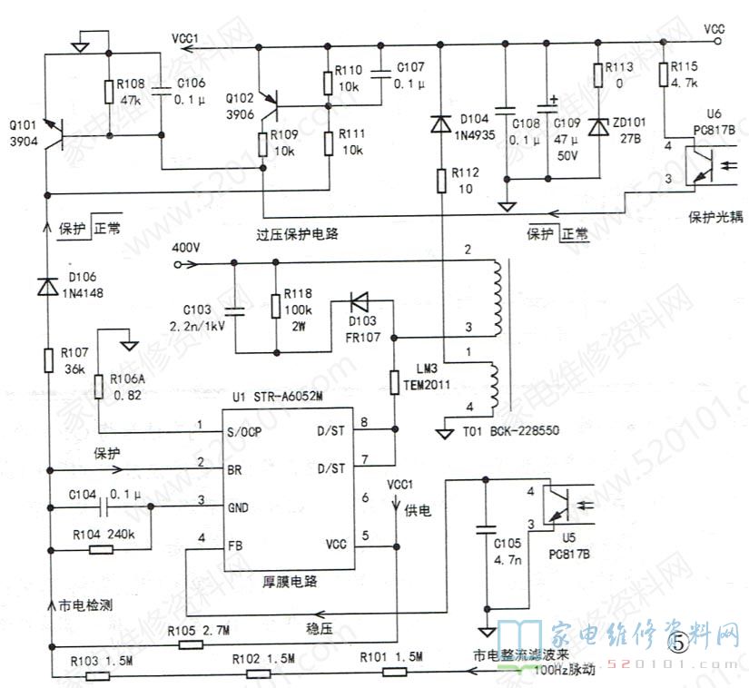 接下来测量U1的⑤脚电压,若异常,则检查⑤脚外部的vCC1电压形成电路R112、D104、C108、C109、ZD101等元件。