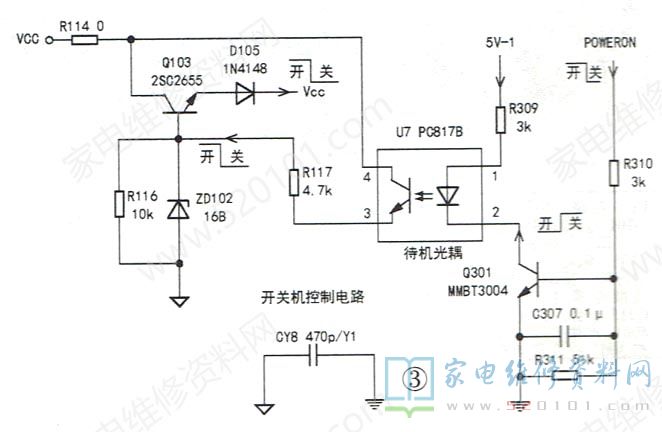 故障现象1:三无、指示灯亮。分析检修:二次开机后,测量POWER ON端是否为高电平,如果为高电平,则测量PFC电压和U4的①脚(VCC)供电,如果PFC电压供电仅为300V,则表明PFC电路未工作,首先检修PFC电路;如果无vcc供电,查开/关机控制电路Q301、U7、Q103组成的vCC控制电路,如图3所示。