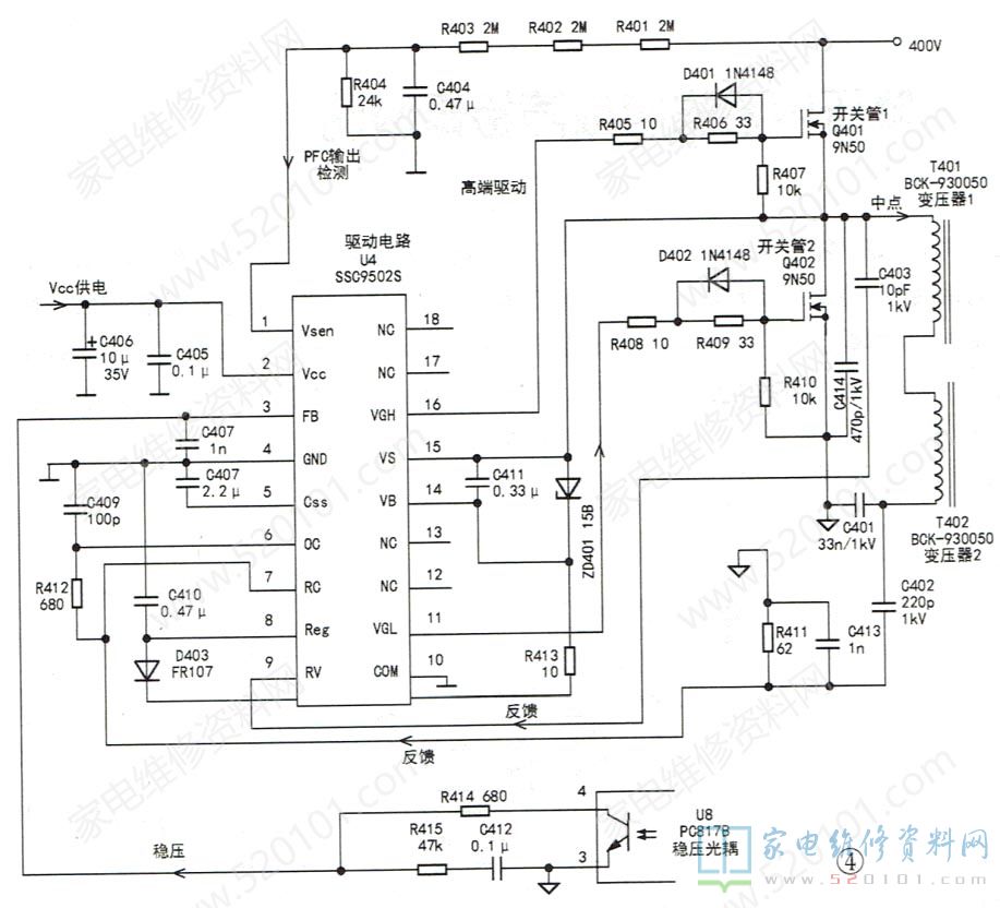 接下来检查U4的11、16脚外接的半桥式推挽电路Q401、Q402和T401、T402次级整流滤波电路,最后更换U4。