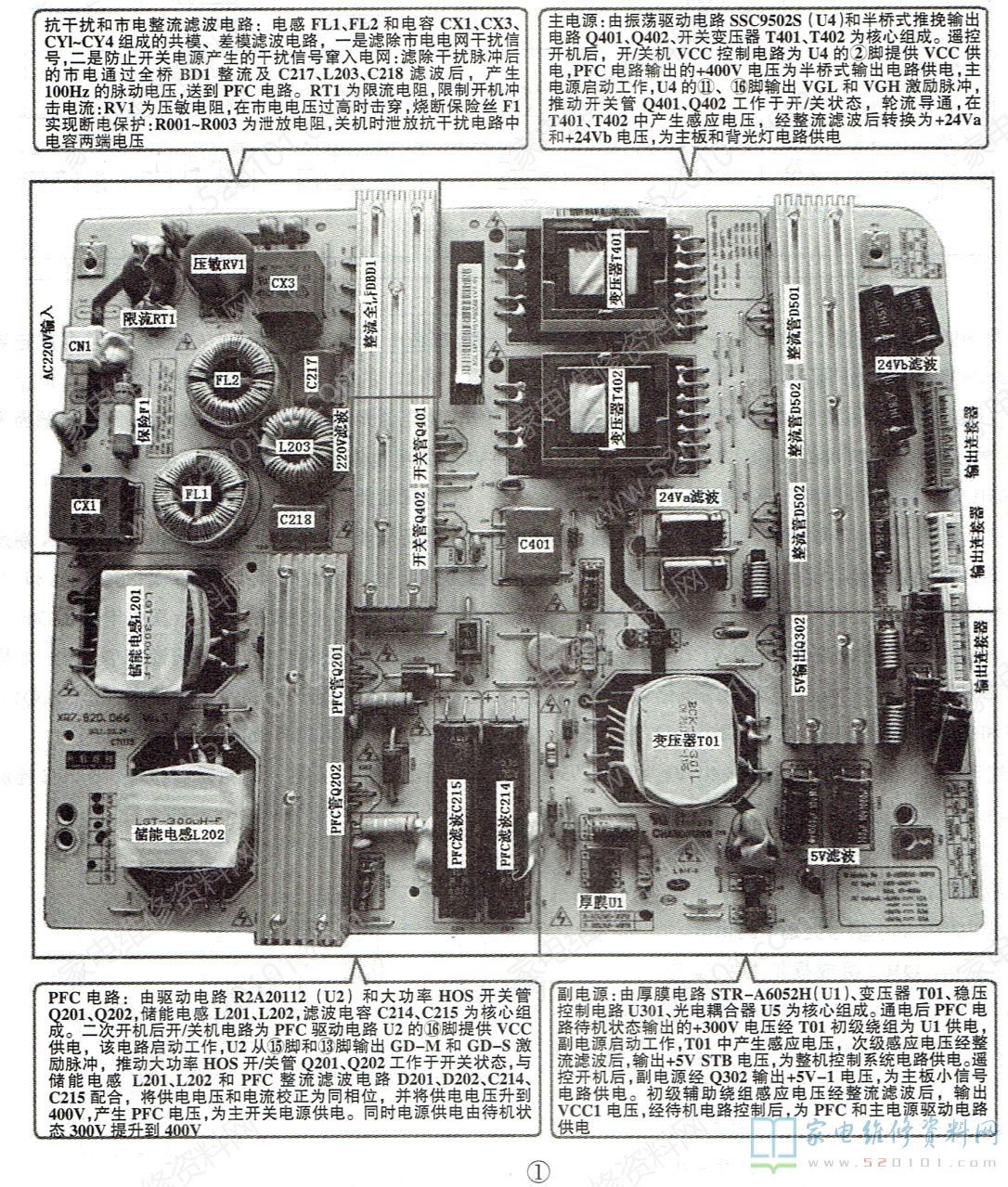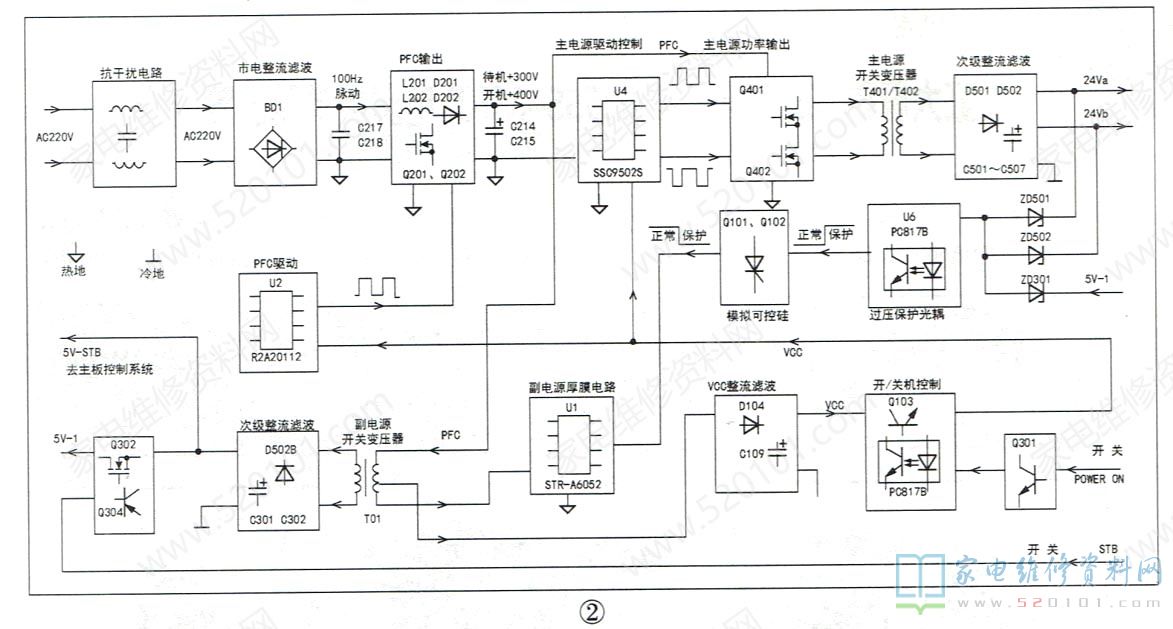工作过程:通电后,整流滤波电路产生的+300V电压为副电源供电,副电源工作,产生5V-STB和vCC电压,如图2所示。5V-STB为主板控制系统供电,待机指示灯亮;二次开机后,vCC电压经开/关机电路控制后为PFC和主电源驱动电路供电,PFC电路和主电源启动工作,以R2A20112(U2)为核心的PFC电路将+300V电压升到+400V;以SSC9502S(U4 )为核心的主电源启动工作后,产生+24Va、+24Vb电压,为主板和背光灯板供电。同时,副电源输出5V-1电压为主板上的小信号处理电路供电。