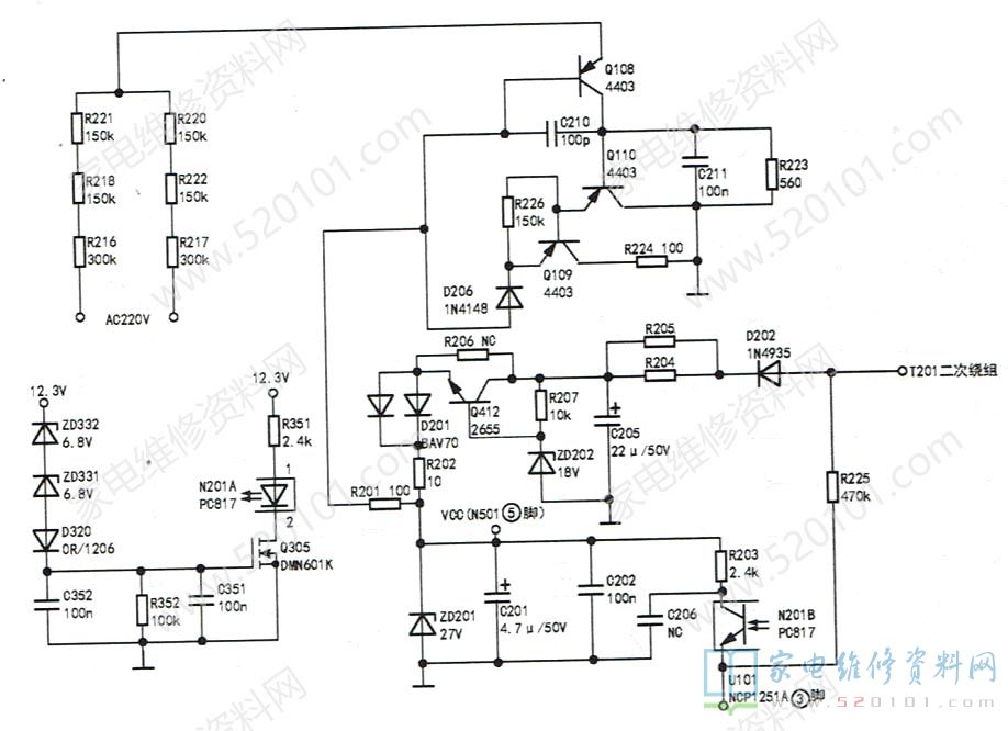 NCP1251 的⑤脚供电电路如图1所示,AC220V电压经R216~R218、R220~R222分压后,经Q108的b-e结二极管整流R201限流.C201滤波、ZD201稳压给U101的⑤脚供电,U101工作后,变压器T201第二绕组产生的电压给D202整流,R204、R205限流,C205滤波,Q412、ZD202稳压,D201降压隔离后为U101的⑤脚供电。Q109、Q110 组成交流欠压保护电路。正常工作时,Q110截止,Q109因基极无电流通路而截止;当AC220V电压大幅下降或整机断电时,Q108反偏截止,c201两端电压通过D206、Q109、Q110快速放电,从而使U101的⑤脚电压迅速下降,电源停止工作,防止开关电源输出的12V电压太低引发系统程序紊乱。