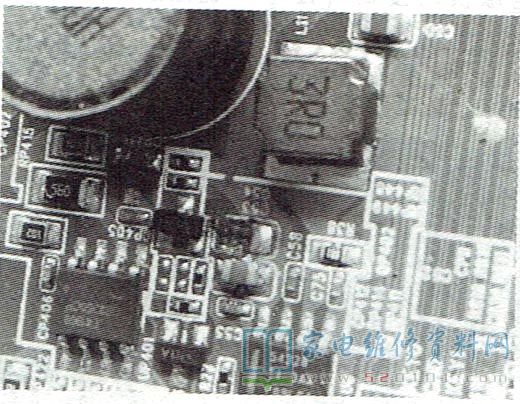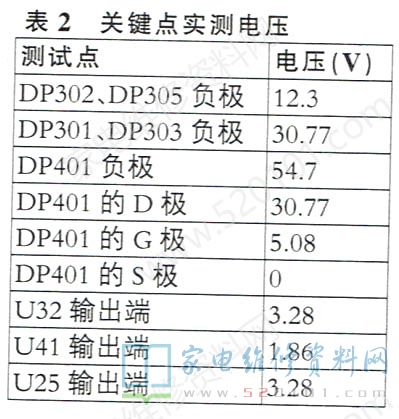 检查中,看到主板中间有个12.3V和GND的插座接口,看走线和12V供电相连,决定用烧机法试试。接上12V/3A电源,看见贴片电容C53和C54冒烟,如图1所示。立即断电,判断C53、C54漏电。拆下这两只电容,找来两只大小相近的贴片电容换上。通电试机,故障排除。正常时,测得该机的关键点电压如表2所示,供参考。