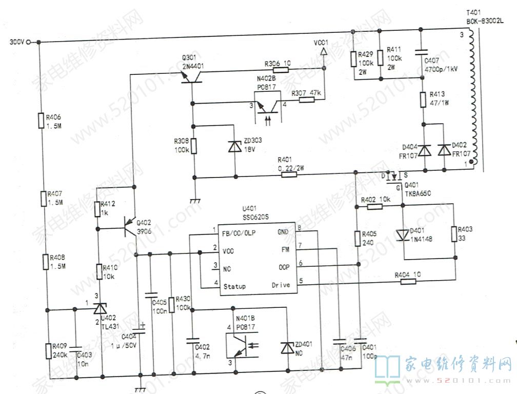 该机主电源由SSC620S(U401 )、Q401、T401等组成,如图1所示。测U401的②脚供电电压为0V。此电压由vCC1电压通过Q301稳压及欠压保护管Q402开/关控制后得到。测Q402的b极、e极电压均为18V,即Q402截止。Q402 b极接U402(TL431 )欠压检测电路,其工作过程如下:当AC 220V电压正常时,全桥产生的300V电压通过R406~R409分压给U402提供控制电压,U402导通,Q402饱和导通;当电网电压过低时,U402控制脚电压低于2.5V,U402截止,Q402也截止。实测U402控制脚电压只有0.5V(正常值约 2.5V),检查外部电路 ,发现电阻R407开路,将其换新后开机,故障排除。