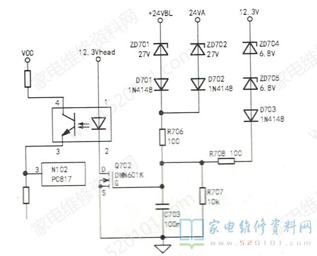 提示:ZD705击穿后Q702.N102导通,U101③科电压升高,IC内过功率保护电路动作,振荡频率下障,则12V输出电压下降。