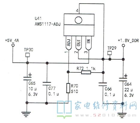 接修一台长虹32D2000型液晶彩电,上电后指示灯亮,不开机。通电测量电源电路送出的12V正常,开/待机控制管Q812基极电平能从低电平跳变为高电平,手摸主芯片微热,说明主芯片已工作。该机开/待机控制实质是通过Q812控制Q809的通断来实现的。5VSTB电压通过Q809输出5V_ 4A电压,然后通过U41转换成1.8V DDR电压,供给主芯片内DDR电路,见图1。实测U41输出电压为0.5V,但供电5V正常。检查U41①脚(电压调整端)设置电阻R70、R72,发现R72阻值增大,替换此电阻后U41输出正常,故障排除。