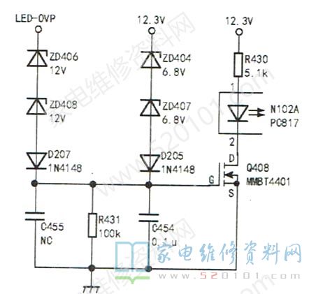 断开N102通电,电视机长时间工作正常。断开Q408试机,故障不再出现,由此推断故障出在Q408 G极所接的过压检测电路中。断开二极管D205,接上Q408通电,故障不再出现,说明故障在12V过压检测电路中。取下ZD404、ZD407加热测试,发现ZD404热稳定性差,更换ZD404后恢复电路,通电试机,电视机工作正常。