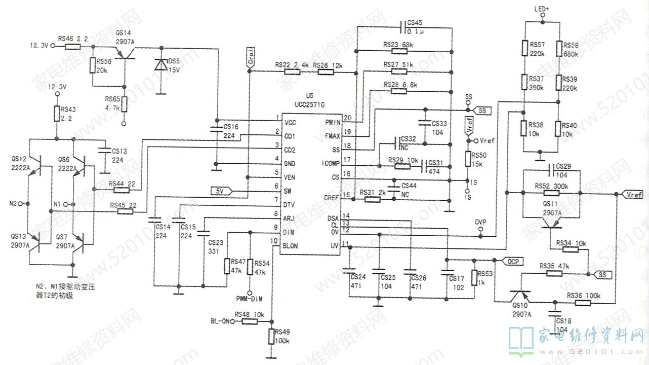 接下来检查恒流控制电路,如图2所示,U5⑥脚输出灯电流控制信号,经IQS8、QS9推挽放大后控制QS1的导通程度来控制灯电流,同时灯电流又经RS16反馈给U5,以实现LED工作电流的闭环控制。经查,灯电流检测电阻RS51开路,将其换新后故障排除。