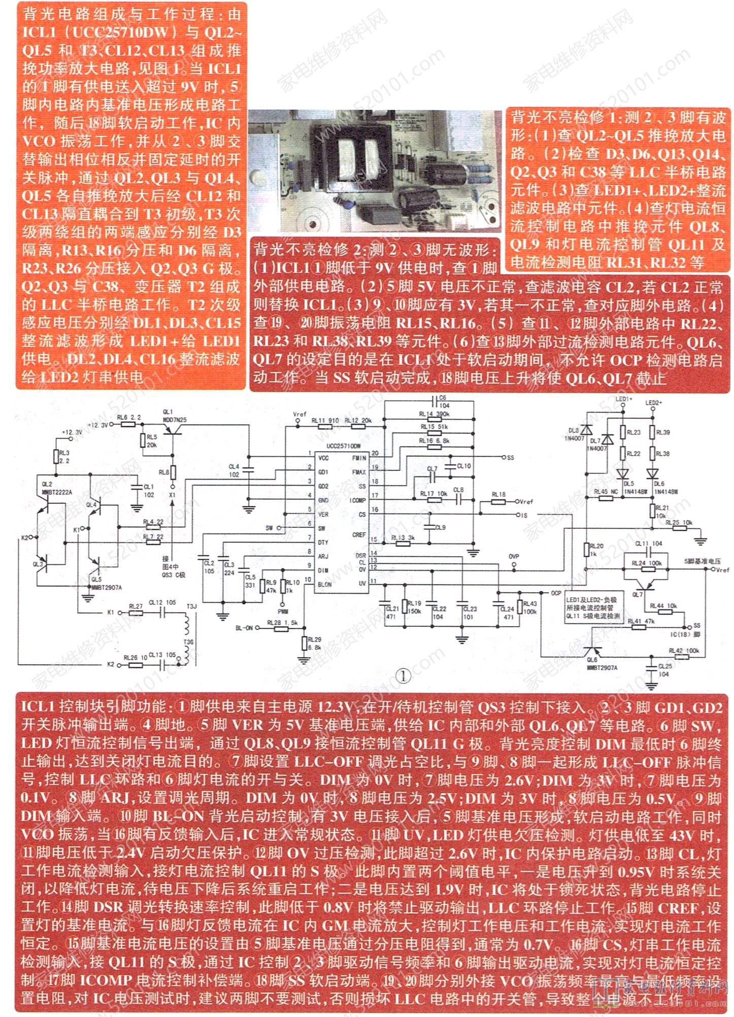 JCL60D-2SC 560电源板组件应用在大屏幕液晶电视上,如长虹生产的65E8、60Q3T、65Q3T等产品。此电源组件能为负载提供一路12V电压供信号板工作,还能为背光电路提供驱动两路LED灯串工作的120V、驱动电流达560mA的电压。它所使用的主要IC有PFC块FAN9730CMX(位号:IC1)、背光驱动块UCC25710DW(电路编号:ICL1)、电源控制块LD7538RGL(电路编号:IC5)。此电源组件的电路图上没有标注元件参数,笔者将实际维修时的测试参数标注在图解上,供维修参考。