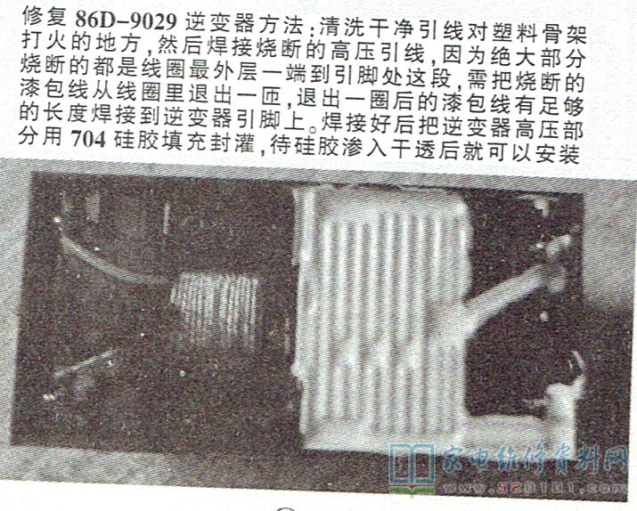 接修一台长虹LT37710X液晶电视,故障表现为黑屏有声音,拆开机器,测量T402( 86D-9029 )逆变器高压端电阻已经开路,拆掉逆变器发现高压线圈绕组一引线烧断,这也是此板通病,更换逆变器后故障排除。换下的逆变器多了,便尝试对这种损坏的逆变器进行实验性修复,最后确认是可以修复的,前提是高压线美不是内部打火,线圈必须没有烧煳和短路现象,而且高压绕组电阻值必须在0.44Ω以上方可。首先把引线对塑料骨架打火的地方清洗干净,然后焊接烧断的高压引线,因为绝大部分烧断的都是线圈最外层一端到引脚处这段,所以需把逆变器线圈烧断的漆包线退出一圈,并有足够的长度焊接到逆变器引脚上。焊接好后把逆变器高压部分用704硅胶填充封灌,如图1所示。