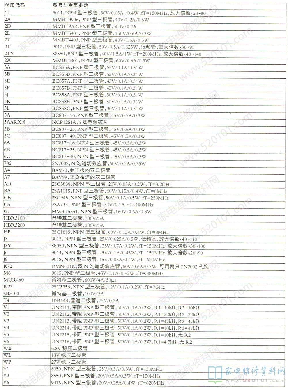 欣锐(HS)及全汉(FSP)系列液晶电源组件常用贴片元件主要参数速查表 2022-11-12 20:13:34 阅读 816 次 评论 0 条 摘要: 欣锐(HS )及全汉(FSP )系列液晶电源组件有数十种型号,既有单独的电源板组件,又有电源背光二合一组件,主要用于长虹各型液晶彩电中,右图为带阻PNP型三极管UN2111~UN2116的结构图。 欣锐(HS )及全汉(FSP )系列液晶电源组件有数十种型号,既有单独的电源板组件,又有电源背光二合一组件,主要用于长虹各型液晶彩电中,右图为带阻PNP型三极管UN2111~UN2116的结构图。 版权声明:本文为转载文章,版权归原作者所有,欢迎分享本文,转载请保留出处! 点赞 分享: PREVIOUS:中华映管(CPT)液晶屏接口参数速查表 NEXT:715G5246-P02电源背光(LED)二合一板电路原理图 文章导航