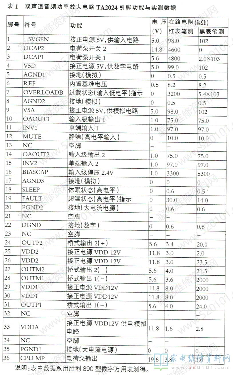 接修一台长虹CHD-W320C6L型机,伴音声小,即使将音量调至最大也只能听到较小的声音。分开机测得功放集成块UA1(TA2024)的11脚电压为1V,功放供电12V也无问题。TA2024是一种高效率的10W双通道D类音频放大器,内置开/关机噪声抑制、过热和短路保护电路,其引脚功能与实测数据见表1。经查,功放块外围元件无异常,估计TA2024损坏。换新后试机,伴音恢复正常。