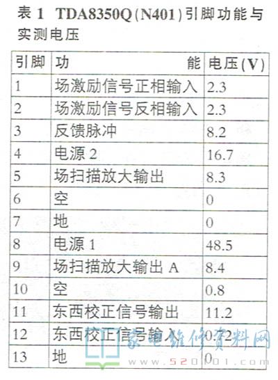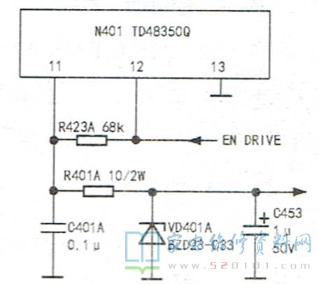 仔细观察图像,发现不抖动时图像有些偏大,问题会不会出在枕校电路上?该机枕校由场块TDA8350Q的11~13脚完成,如图1所示。开机,测得枕校电压为15.2V,有点偏低;断开TDA8350Q的11脚,图像无变化,枕校电压还是15.2V,看来问题就出在枕校电路中。经查稳压二极管VD401A反向漏电。该管型号为BZD23-C33,应该是一只33V稳压管,且功率较大。因是上门维修,工具箱里没有这个零件,于是用两只18V/1W的稳压管串联后代替。开机,图像行幅正常,上部抖动的毛病也消失了。