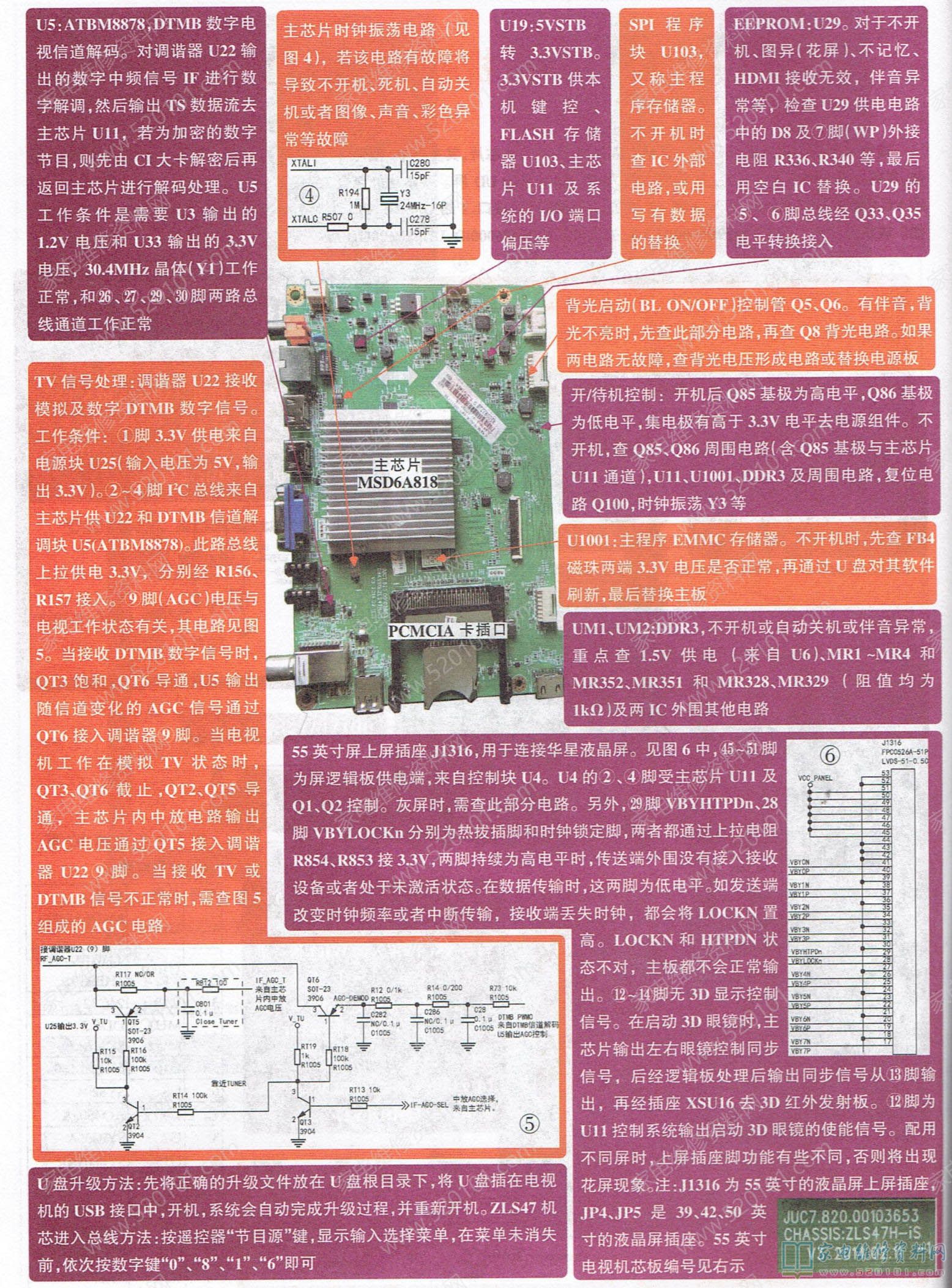 长虹液晶电视ZLS47H-iS机芯主板维修图解 2022-12-04 20:12:15 阅读 786 次 评论 0 条 摘要: ZLS47H-iS机芯采用MSTAR公司生产的MSD6A818QVA为主芯片,其主要IC型号、位号见表1。该机芯产品带多媒体和MHL功路VGA输入、3路HDMI输入、1路AV输出、2路USB2.0接口、1 ZLS47H-iS机芯采用MSTAR公司生产的MSD6A818QVA为主芯片,其主要IC型号、位号见表1。该机芯产品带多媒体和MHL功路VGA输入、3路HDMI输入、1路AV输出、2路USB2.0接口、1路USB3.0接口、1路LAN网络接口,具有无线WIFI、3D功能。该机芯代表产品有UD39B6000D、D42B6000D、UD50B600OD,UD55B6000D等。 版权声明:本文为转载文章,版权归原作者所有,欢迎分享本文,转载请保留出处! 点赞 分享: PREVIOUS:厦华LC40U7液晶电视不开机的故障维修 NEXT:杂牌组装机采用T56UA1.2主板开机三无的故障维修 文章导航