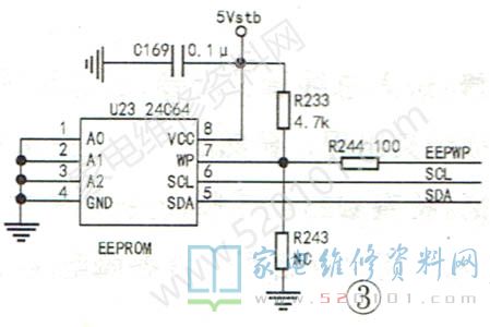 保存用户控制信号的EPROM存储器在电路中的作用与CRT彩电中的一样,其ROM区的数据可任意改写,是最传统的一种存储器。最常用的24C系列存储器规格有24C02/04/08/16/32/64。这类存储器的存储空间较小,故替换时不能随便改变其大小。另外,部分平板电视还用此存储器存储生产线调试数据,有些数据可以进入总线进行调试,这与CRT电视相似。不同电视厂家向EPROM中写入的数据不同,调试参数或功能项目用英文或字母表示,在不知作用时不能随便调试,如"ClearEPROM"表示将所有用户数据清空,"Color Sys-tem"."Sound System"可能出现无彩色或无伴音故障。