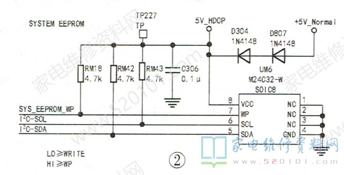提示:ZLS59机芯彩电进入总线的方法如下:顺序按下遥控器上的莱单、情景模式、标准模式、上、右、右、0、8、1、6。长虹ZIS59机芯彩电的EPROM电路如图2所示。UM6的①~④脚接地,⑤、⑥脚为I2C总线通道,I2C总线分别通过电阻RM42、RM43接在⑧脚供电上,以保证总线的驱动能力。⑦脚(WP)为写保护脚,只有在对EPROM写入数据时,⑦脚才为低电平,其他状态下⑦脚应为高电平.如果⑦脚电平异常,则会出现不开机故障。