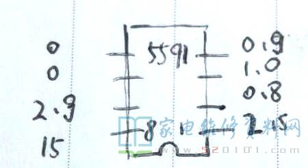 接修一台长虹3D46C2000i液晶电视,故障不开机 ,拆机检测发现K15A50D烧了,保险管也烧了,在某宝里买回15a50d和FA5591,焊上测量发现5591的第一脚电压1.8v,8脚0.19V, 8脚供电电压没有,看图发现还有个控制三极管Q301到光耦,在排插con102的ps-on到12v之间接个10k电阻模拟cpu控制信号,在测量5591的8脚12v不稳,测量450v100uf电容两端378v不稳,焊下测量发现已无容量了,换后测量399v,其他输出电压都正常了。