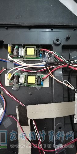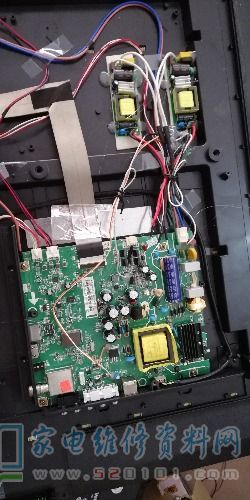 接修一台长虹LED42c2000背光升压场效应管短路引起三无,几个月前用iRFp460A代换过,如今旧病复发,整张主板换吧,成本太高还要等,本来用那种背光万能板因用完了,尝试用LED灯的驱动电源代换,原机两组LED,每组90V,因没有双组输出的驱动电源,所以用了两个,做一个简单的电路,用一个12V的继电器控制220v的进电端,背光控制接原机7001的1脚,串一个10k电阻到8050基极,试机亮度正常。