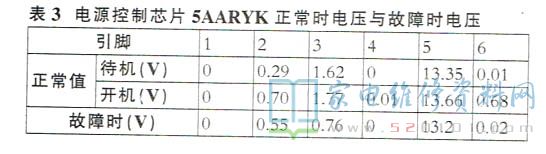 例1:接通电源后,红色指示灯亮,约十秒后指示灯熄灭,不能开机。分析维修:接通电源后,测得开关电源12.3V输出端的电压始终为4.79V,35V电压始终为0V,怀疑升压电路有短路性故障,但检查后未见异常。检查开关电源次级整流滤波电路也正常。判断故障在开关电源初级,测量300V电压正常,U101各脚电压见表3,与正常值比较,发现多个引脚电压不正常,一时很难分析出故障部位,决定先对电解电容C201(4.7uF/50V)和C205(22uF/50V)迸行检查,这两个电容易出现容量减小故障。经查C201已完全无容量,C205正常。更换C201后故障排除。