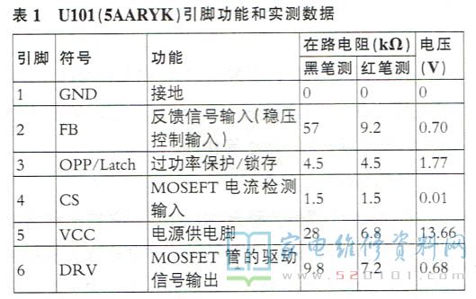 5AARYK型号全称是NCP1251,它是一种电流控制型离线电源PWM控制器,采用峰值电流控制模式,芯片正常工作频率为65kHz,当电源次级工作在轻载条件下时,芯片工作频率自动降到26kHz或自动进入到跳周期工作模式,芯片内置过压、过流保护功能。5AARYK采用TSOP-6型小尺寸封装,其引脚功能和实测数据见表1。