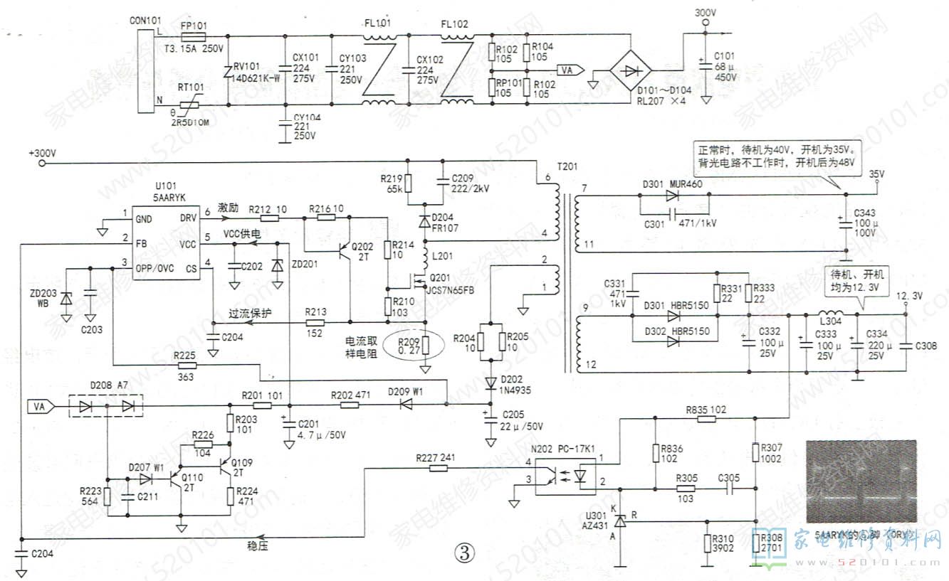 该电路主要由电源控制芯片5AARYK(U101)、开关管Q201、开关变压器T201、三端误差放大器U301、光电耦合器N202等构成。
